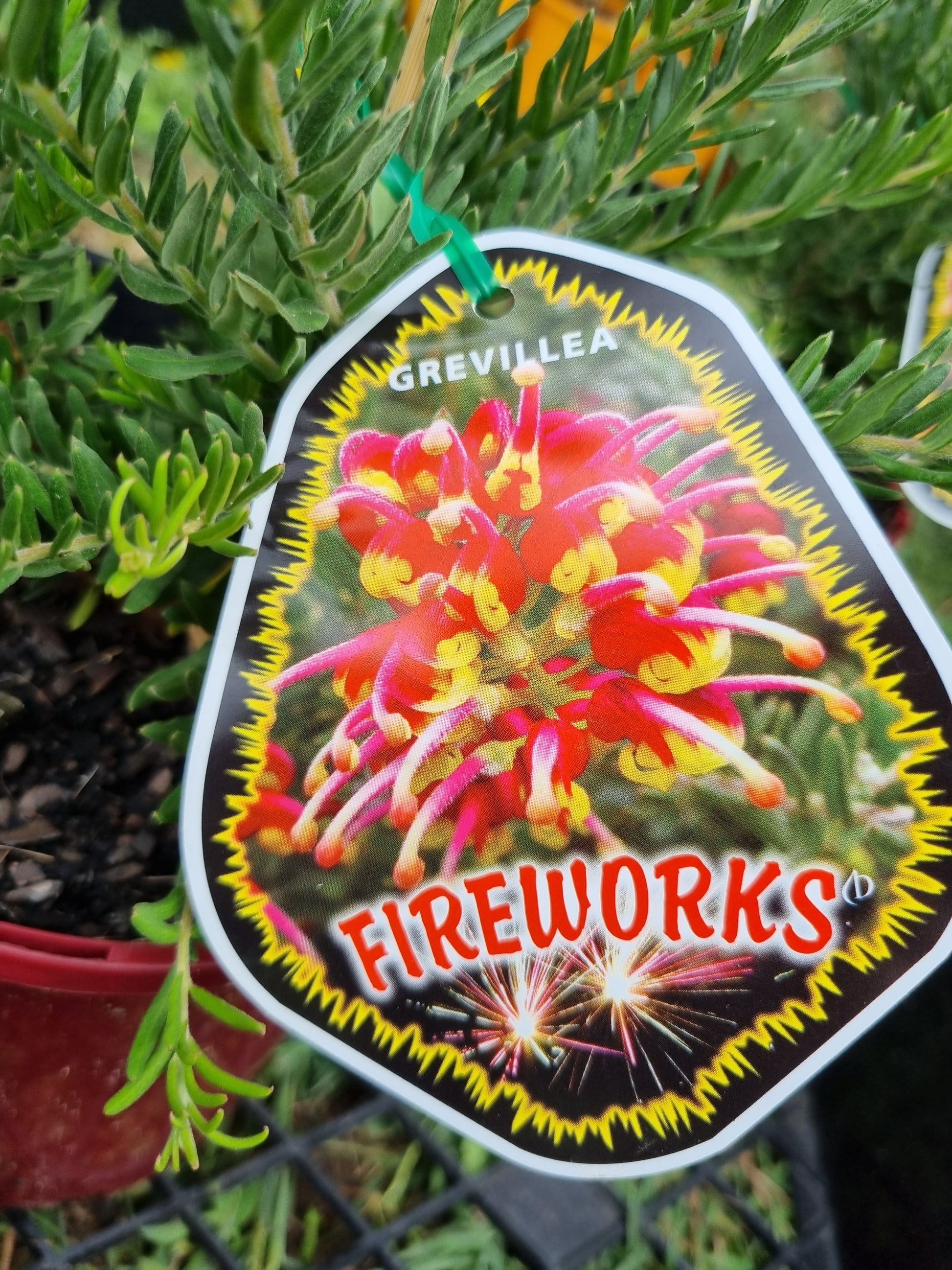 Detailed Description: Grevillea 'Fireworks' is a deliberate cross between Grevillea 'Pink Pixie' and Grevillea alpina, crafted by Peter James Ollerenshaw in Bywong, NSW. Registered in June 2007, this hybrid stands out for its vibrant flower display and compact growth, making it a versatile addition to any garden. Its flowers, which occur on the ends of short branches, along with its blue-green foliage, create a visually appealing contrast.