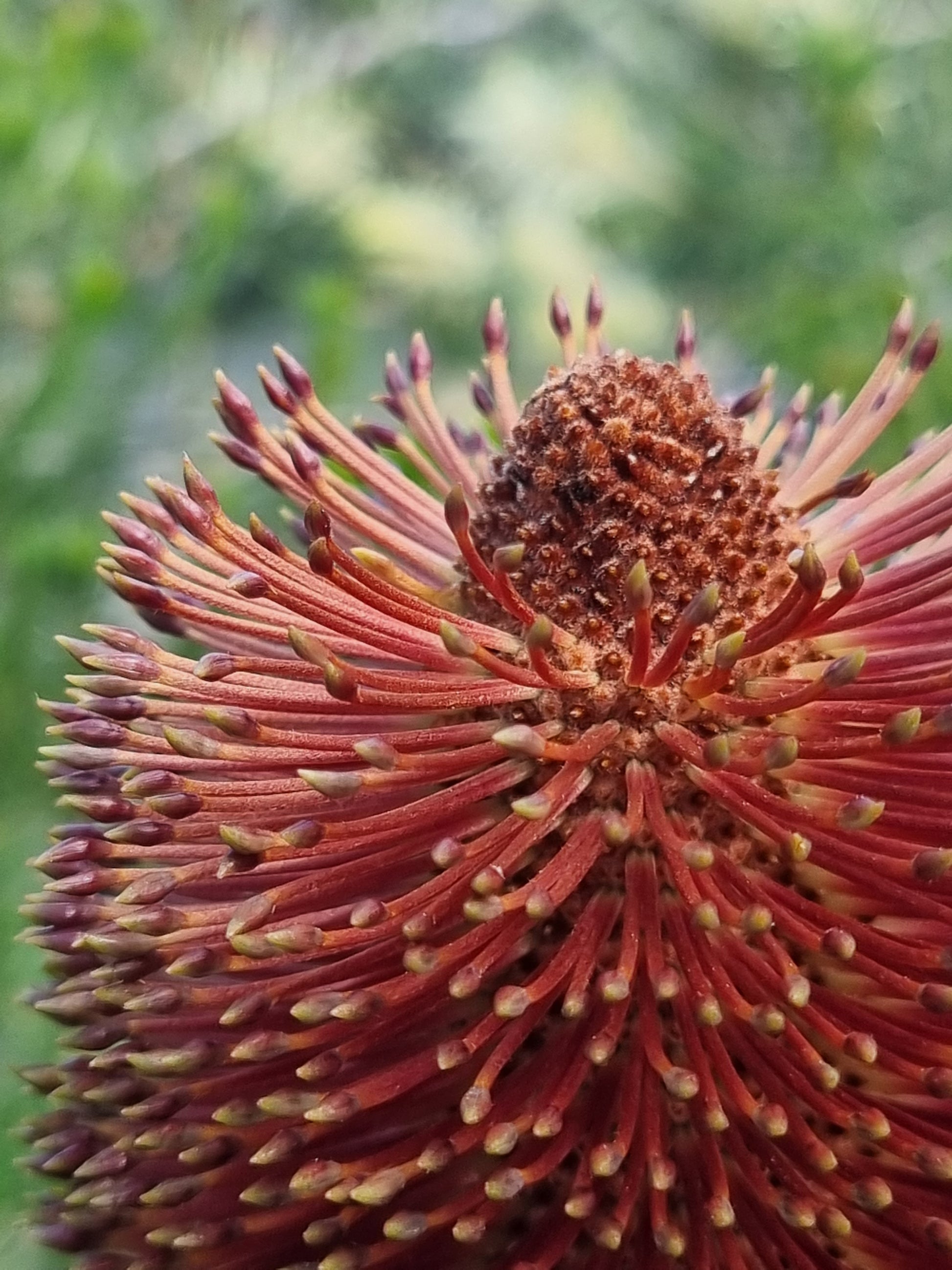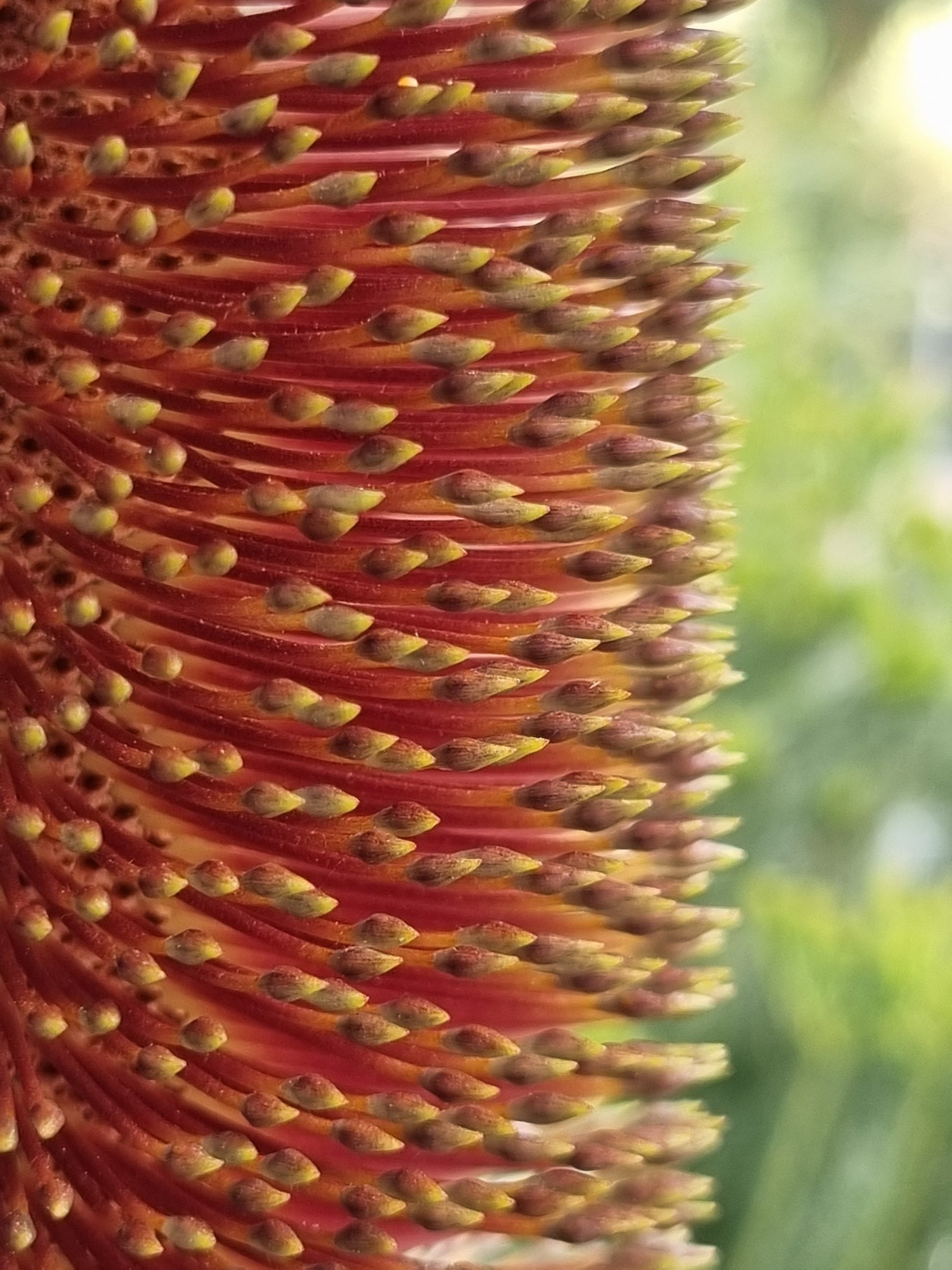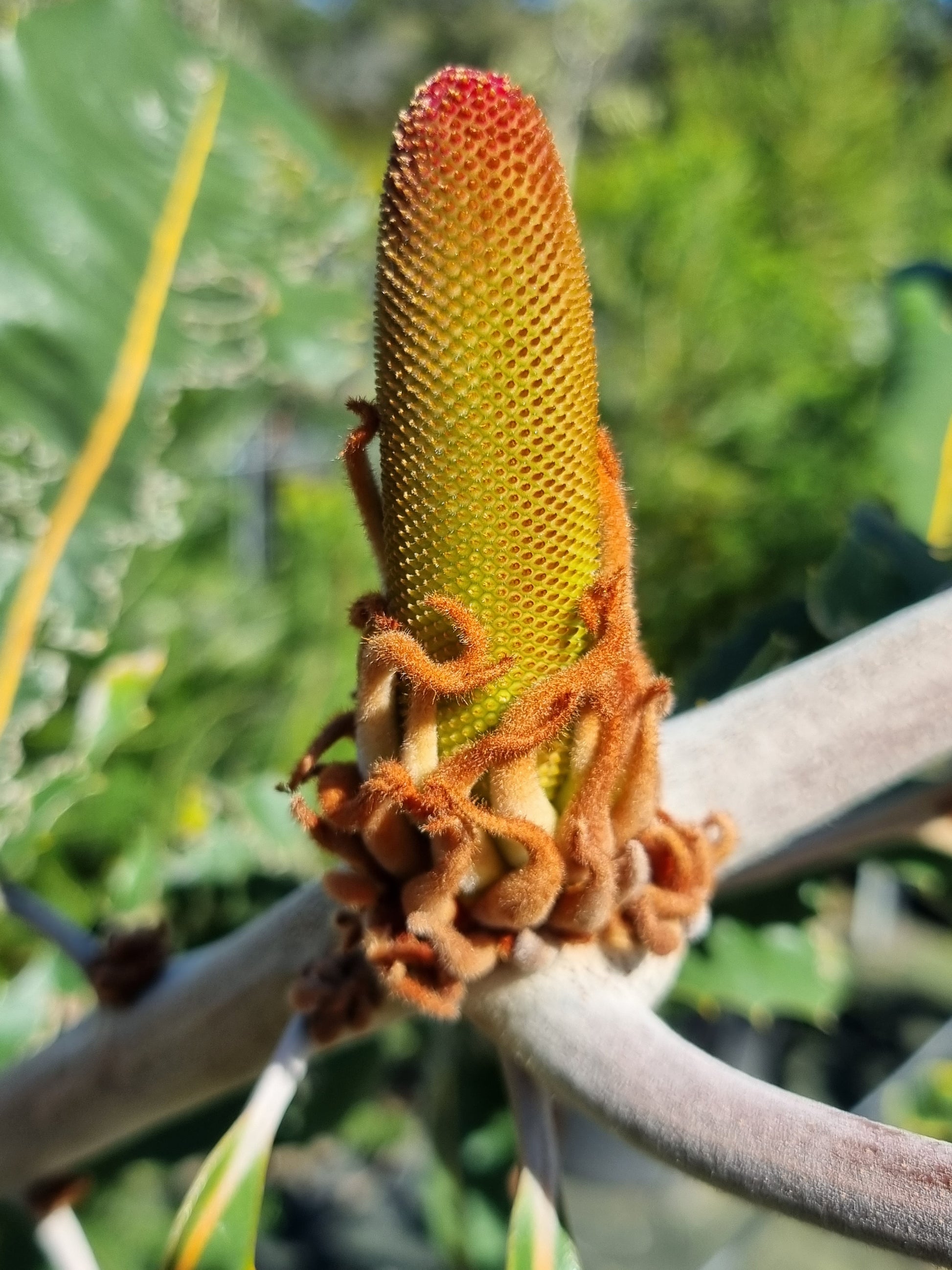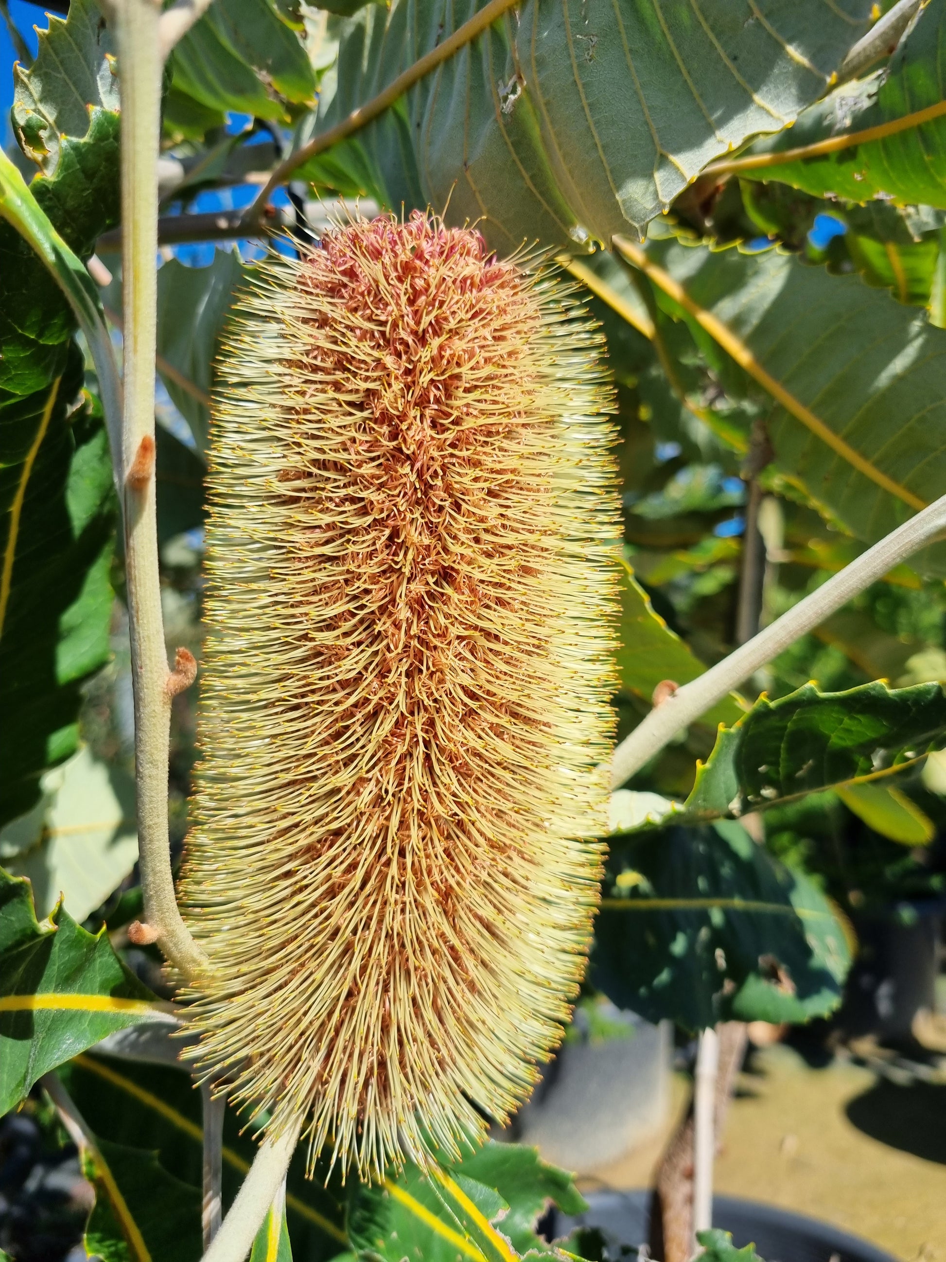 The flower spikes, measuring up to 20 cm in height, begin as vibrant green and gradually age to a golden-brown hue. Blooming from autumn to spring, these flowers are a magnet for birds, bees, and other pollinators, making Banksia robur an excellent choice for wildlife-friendly gardens.